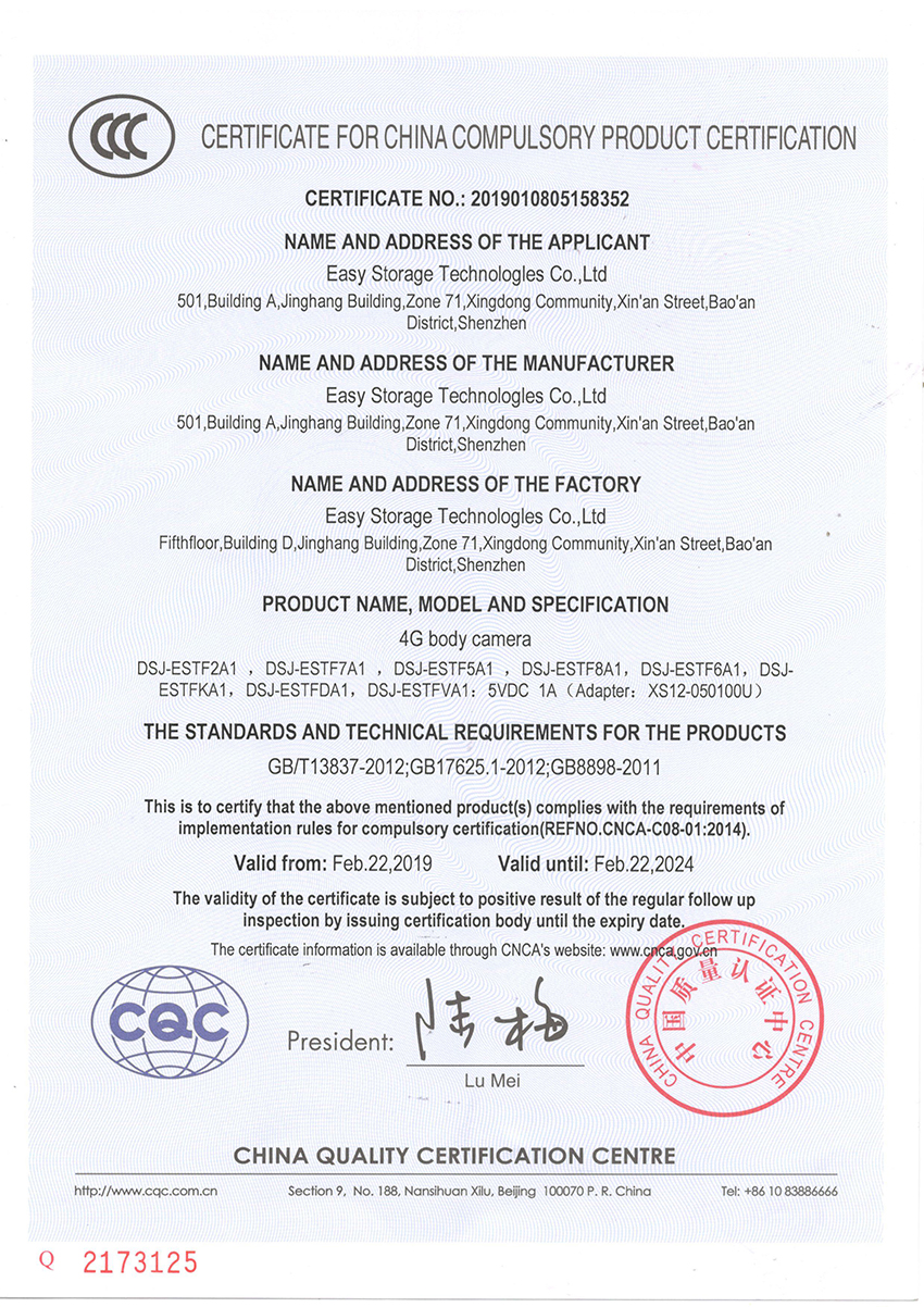 Congratulations on the successful registration of the EASY STORAGE 4G BODY CAMERA CCC certificate