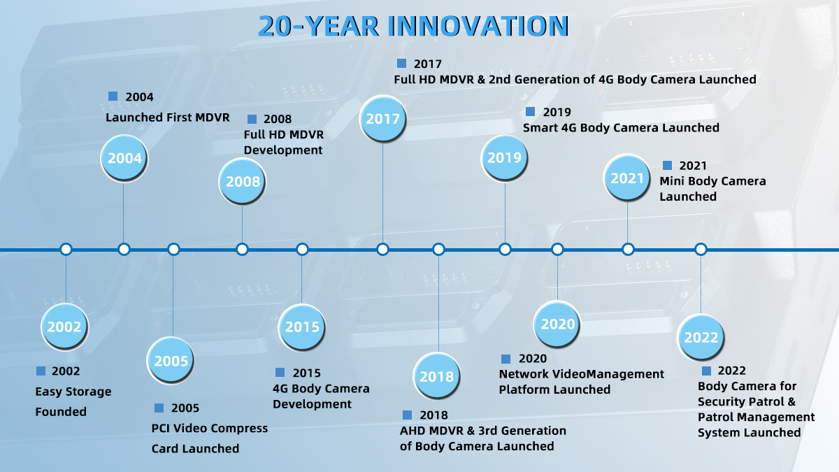 Easy Storage Technologies Co., Ltd. was established in 2002. With a dedicated R&D team, the company has been specializing in product development, production, sale and service of digital audio and video products. Our management always focuses attention on new products & new technology innovation. The MDVR has grown to the sixth generation, Body Worn Camera, which began in 2015, has grown to the third generation.