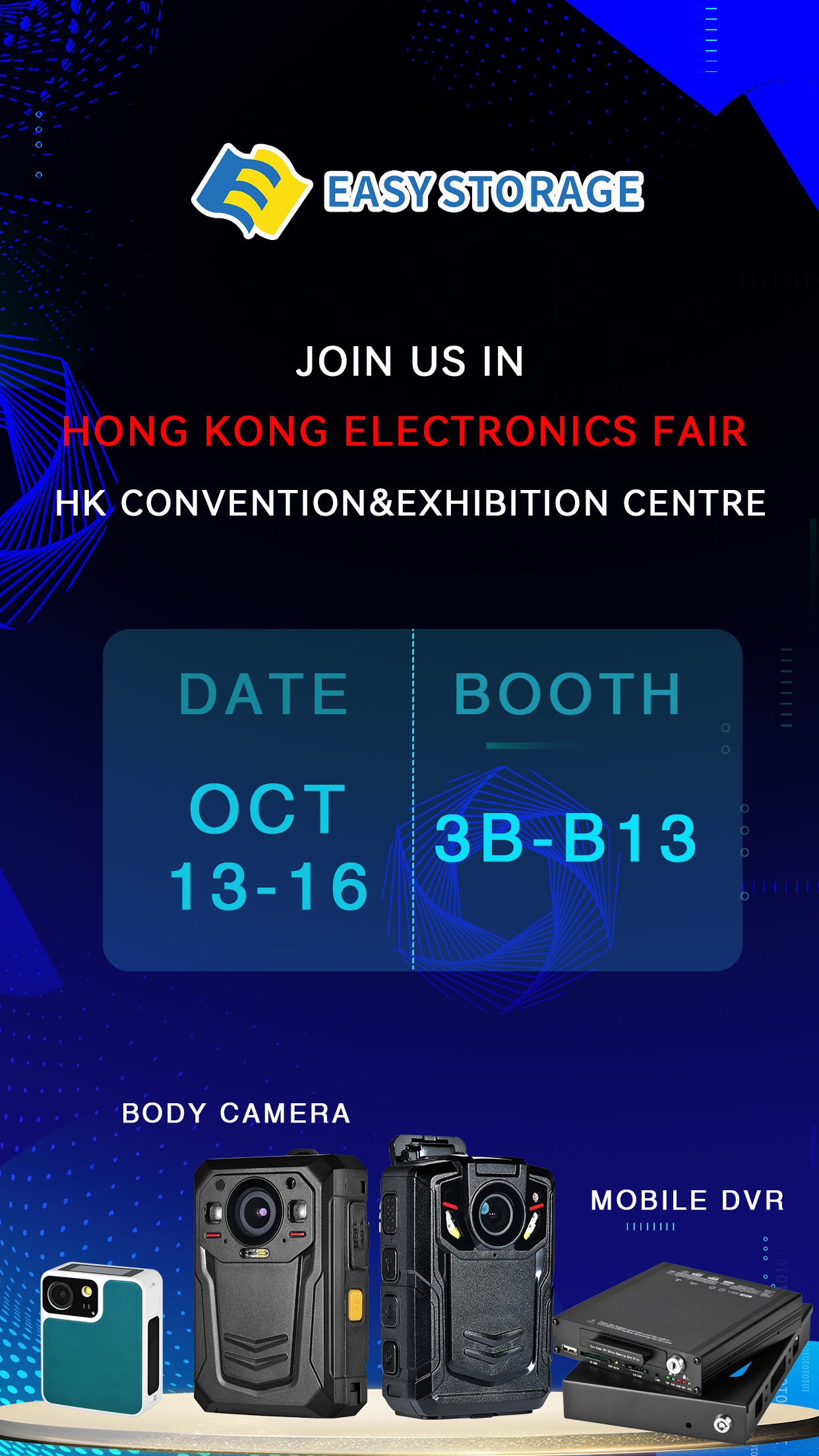 On October 13, 2023, the Hong Kong Electronics Fair (Autumn Edition) was held grandly at the Hong Kong Convention and Exhibition Center! As a leading research and development manufacturer of 4G Body Camera in the industry, EASY STORAGE Technology has made a grand debut with products such as 4G Body Camera, and MINI Body Camera, as well as Docking Station and 4G Vehicle Monitoring Systems. Welcome to EASY STORAGE Technology's on-site booth 3B-B13 to obtain the latest product information!