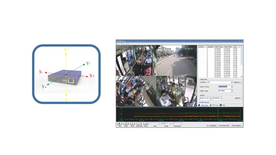 The DVR has built-in G-Sensor, which can be used to send alarm when there is a car crash accident. The G-Sensor information can also be used for driver behavior analysis.