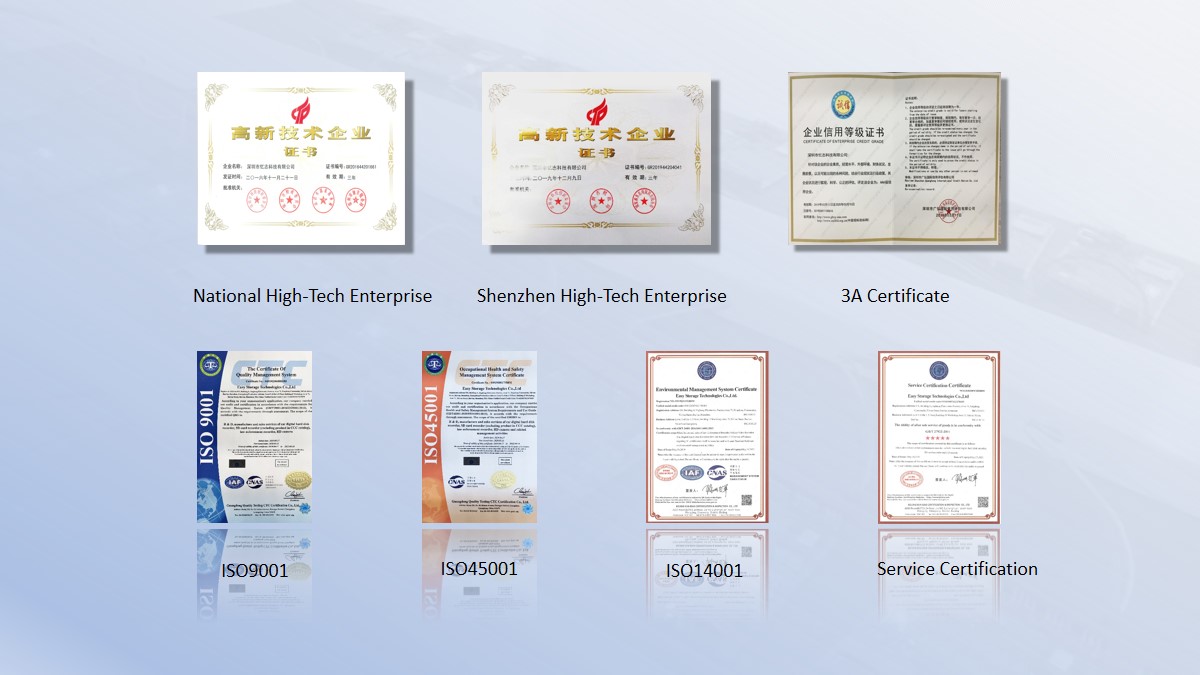 Easy Storage a reçu le prix "Entreprise nationale de haute technologie" et "Entreprise de haute technologie de Shenzhen" en 2016. Nous avons également passé les normes ISO9001, ISO45001 et ISO14001. Tous les produits sont protégés par des droits de propriété intellectuelle indépendants et ont passé les normes européennes CE & E- Certification MARK, ainsi que la certification US FCC La société a également obtenu un certain nombre de droits d'auteur sur les logiciels.