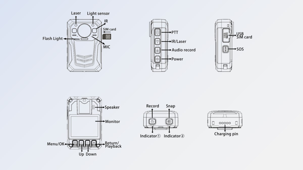 Indicateurs lumineux pour le chargement, l'inactivité, l'enregistrement vidéo, la photo, l'enregistrement audio |