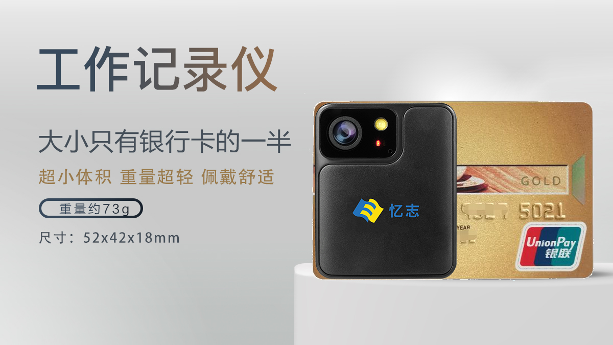 忆志音视频工作记录仪(F1)具有体积超小,重量超轻的特点。在原来执法仪的小体积下,更是将体积整整缩小了几倍,体积达到了银行卡的一半大小,重