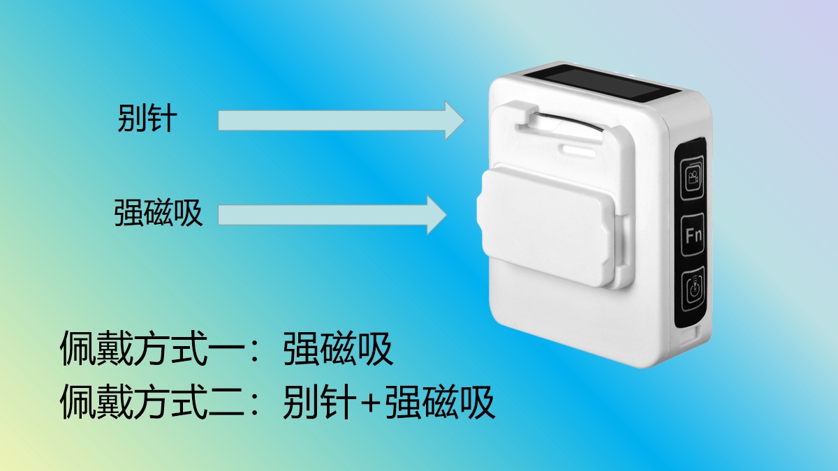 忆志工作记录仪的佩戴灵活舒适,采用强磁吸的佩戴方式,可以牢牢的固定在衣服上,要是不放心,还可以采用强磁吸+别针的方式佩戴,更加牢固。