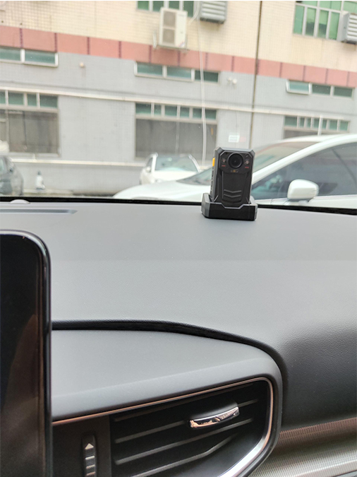 1、底座安装。用3M胶把底座粘在车前面板上,防疫记录仪插在底座上,照车驾驶室内。