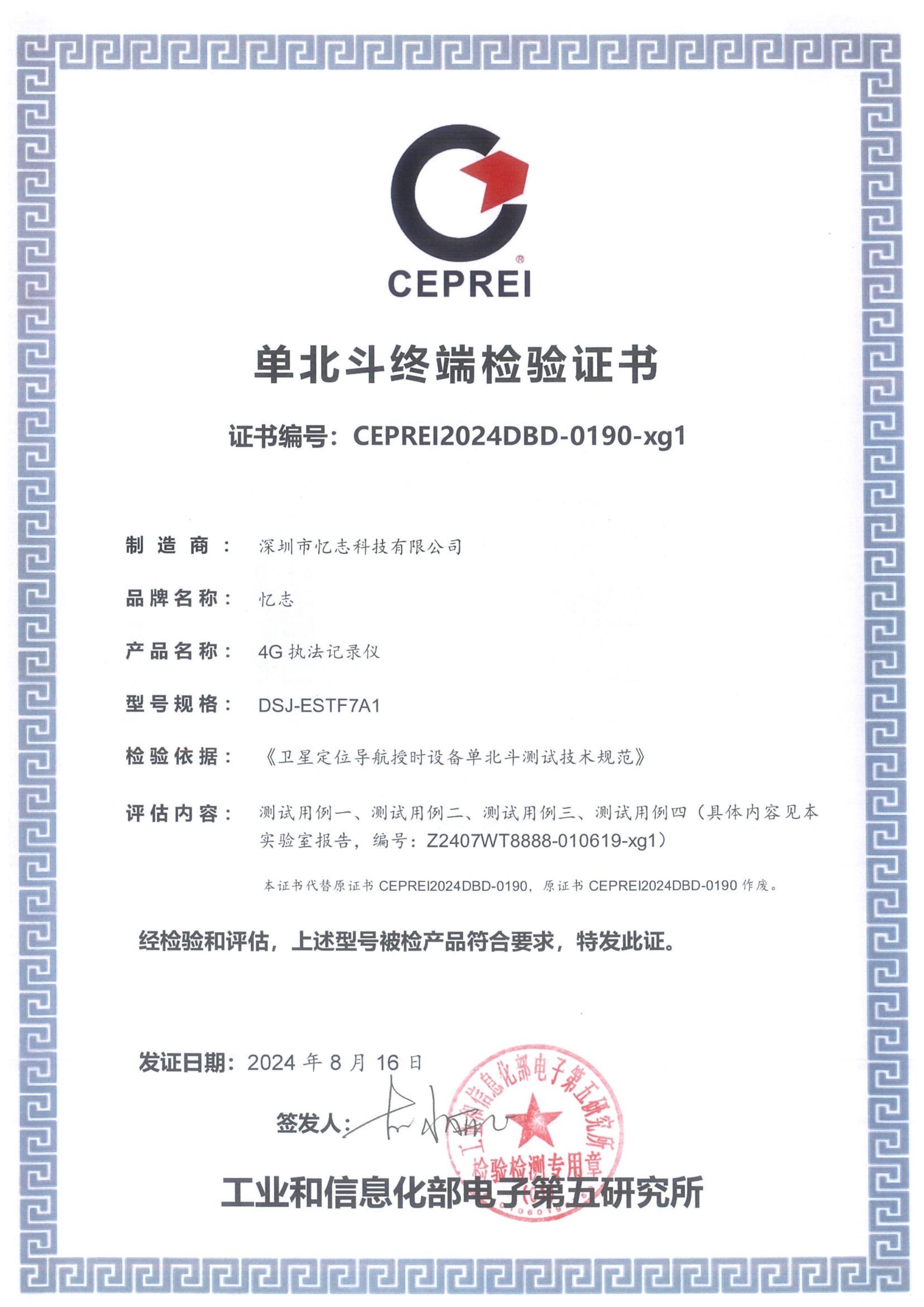 快讯|忆志4G执法记录仪单北斗定位功能荣获权威认证证书