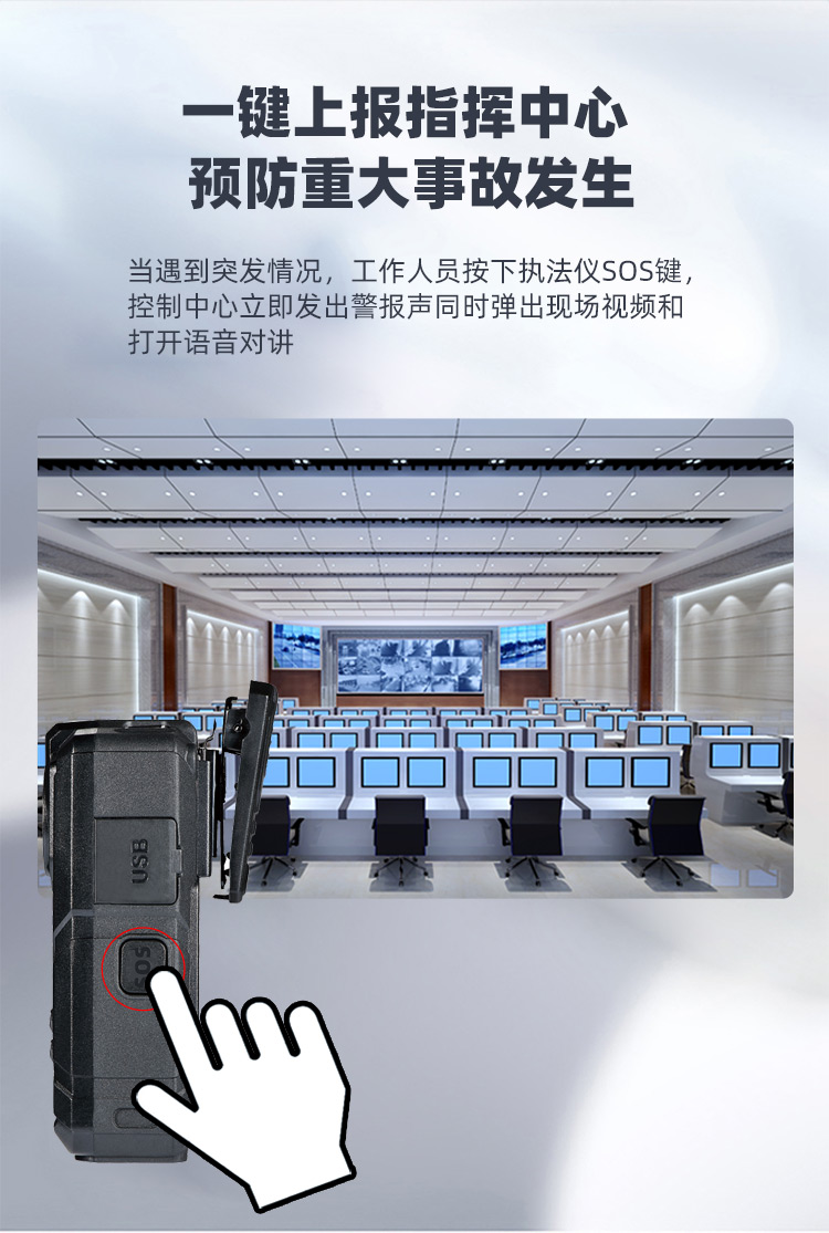 ●具有SOS一键报警功能,产生报警时平台可自动发出报警声音,并可自动弹出实时视频与抓拍照片,报警录像不会被自动删除。