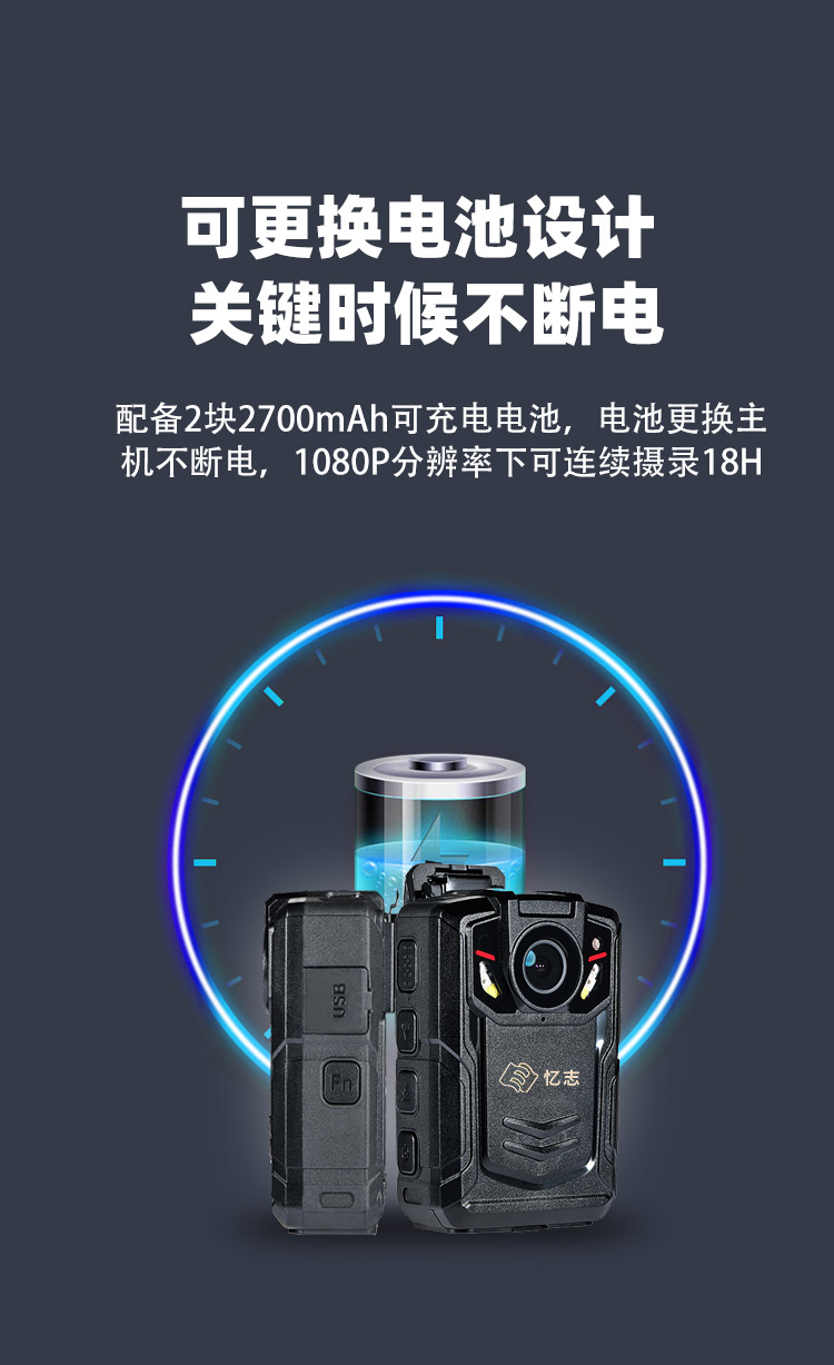 ●可更换电池设计,常温下更换一次电池可连续1080P分辨率下连续摄录不低于18小时。