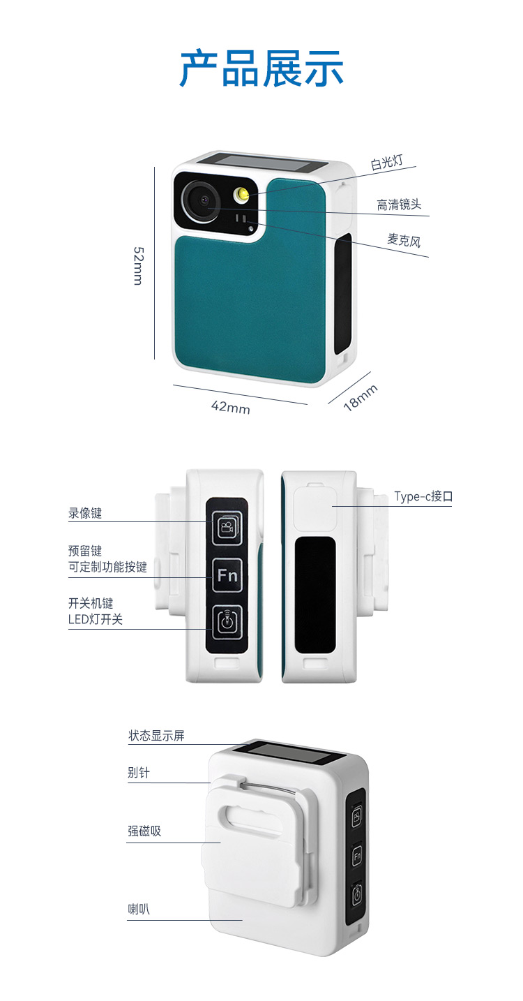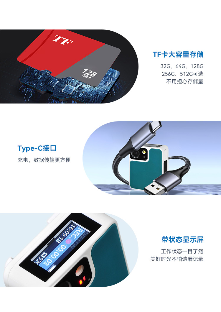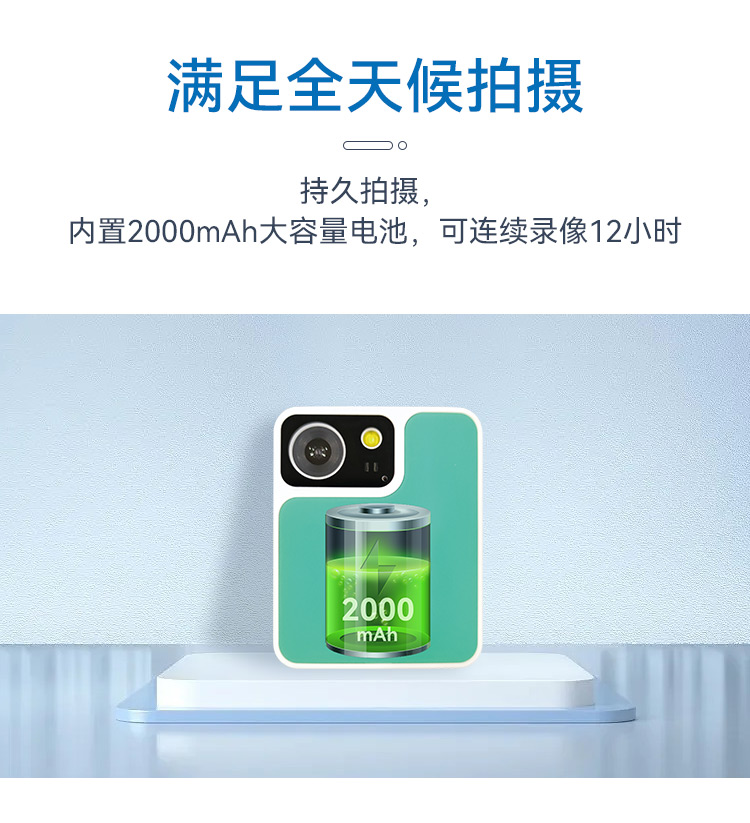 ●续航能力强,内置2000mAh大容量电池,1080P分辨率下可持续摄录12小时以上。