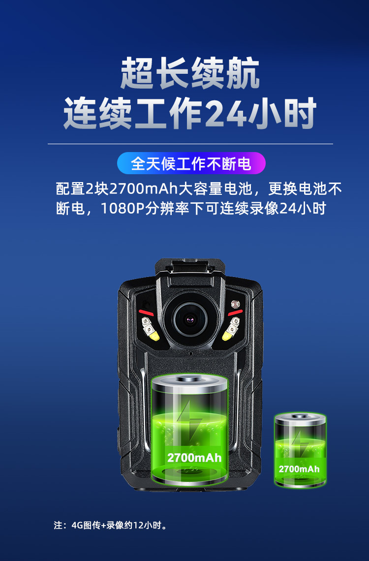 2 x 2700mAh电池,内置60mAh备用电池(更换电池时执法记录仪可连续工作)