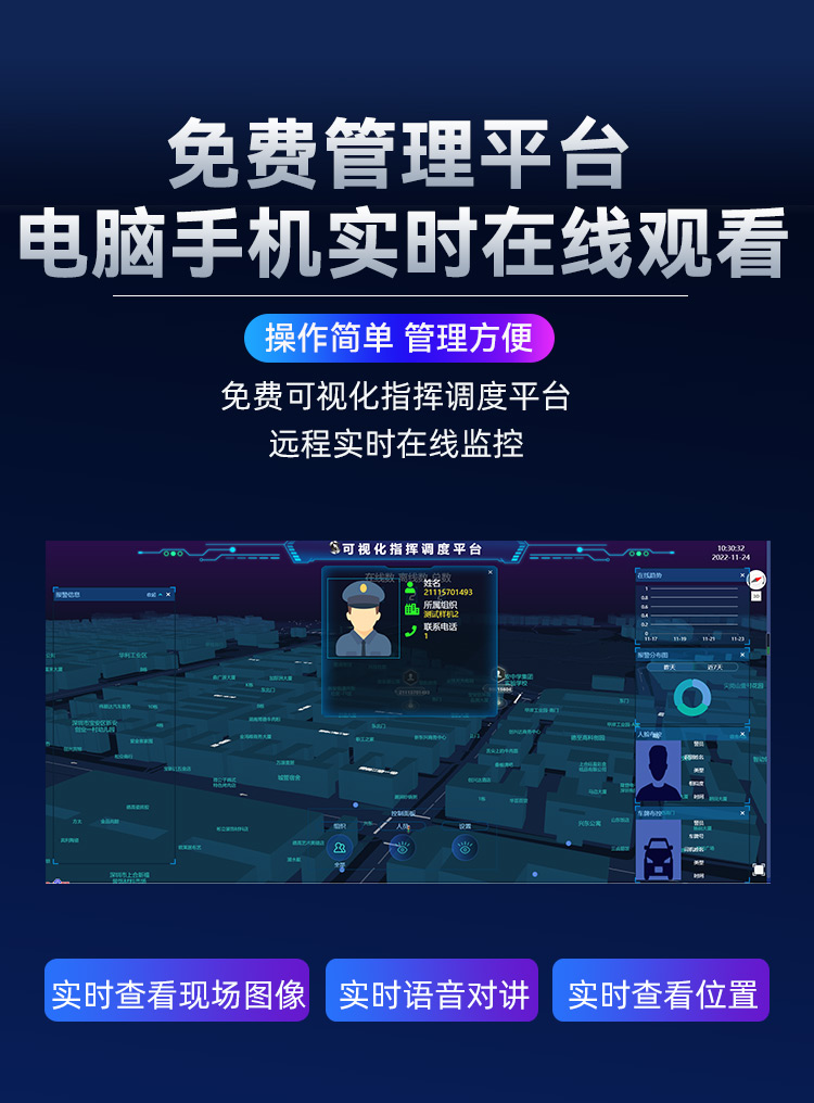 支持实时预览/实时定位/轨迹回放/对讲/监听/远程命令下发等
