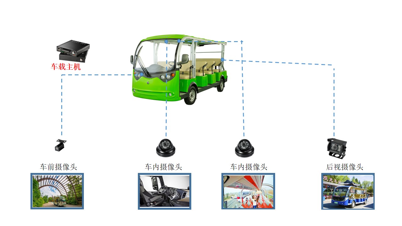 可支持多路摄像头,摄像头清晰度可达1080P,全方位监控观光车情况,监看游客是否将身体探出车外等。